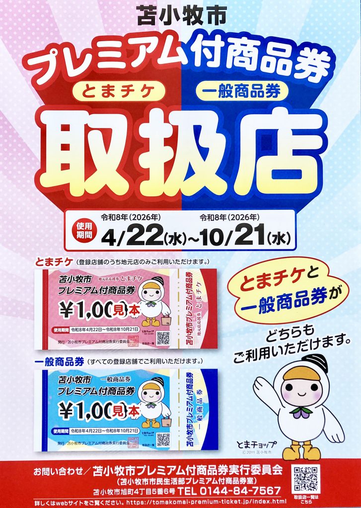2026年4月22日 / 最終更新日 : 2026年4月22日 qat-takumi.m お知らせ 「苫小牧市プレミアム付商品券 2026」ご利用いただけます。 【QualityArtTAKUMIで「プレミアム付商品券」をご利用可能です!】 本日、4月22日(水)より購入引換が始まった 「苫小牧市プレミアム付商品券」 QualityArtTAKUMIでもご利用いただけます。 赤の【とまチケ】青の【一般商品券】 どちらもご利用いただけます。 使用期間:2026年・令和8年4月22日~2026年・令和8年10月21日 取扱店一覧はこちら 取扱店舗マップ Follow me! FacebooktwitterHatenaPocket